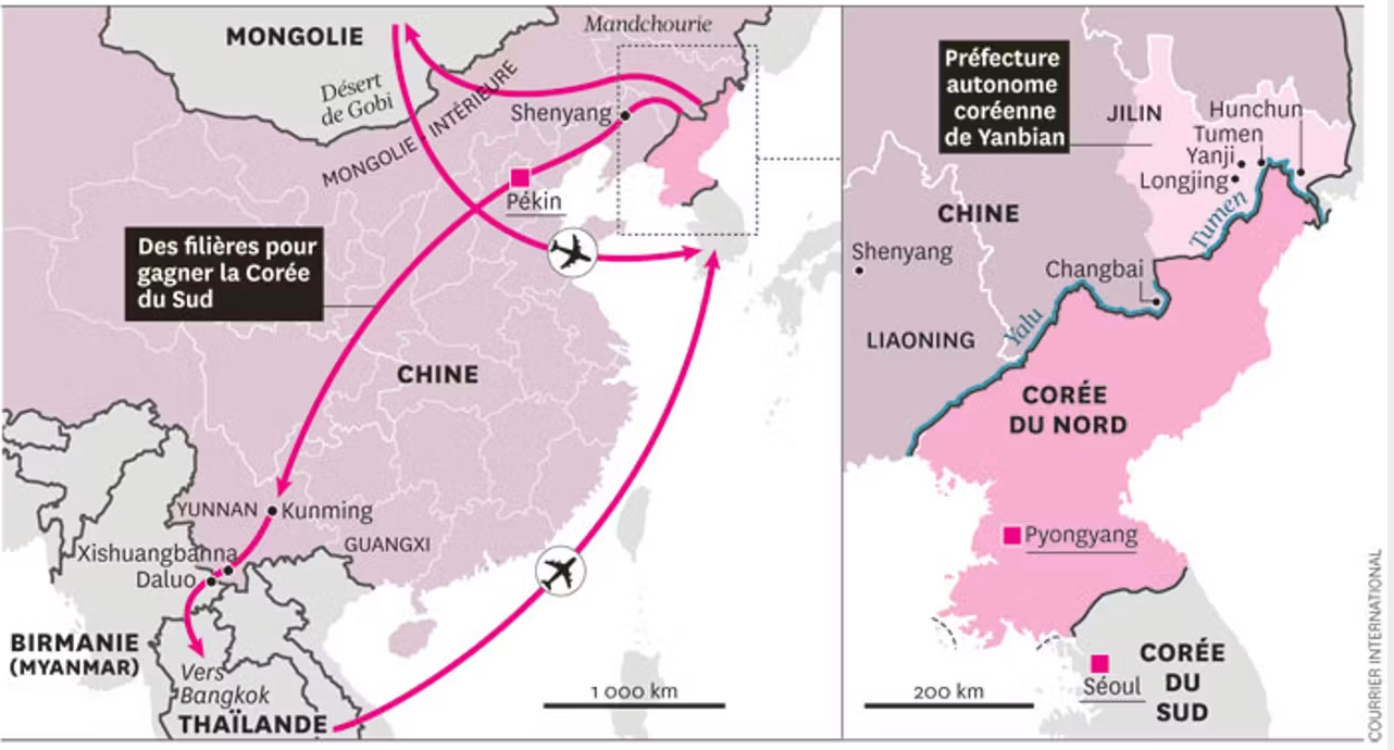 Dans les années 1990, la famine nord-coréenne accentue significativement ces dynamiques migratoires, entraînant une hausse des départs vers les pays voisins. La zone coréenne démilitarisée, ou no man’s land, à la frontière intercoréenne, fortement surveillée et quasi infranchissable, incite de nombreux Nord-Coréens à emprunter des routes alternatives par le nord, faisant de la Chine la principale terre de transit. Cependant, les transfuges se heurtent à de nombreuses difficultés administratives liées à un statut juridique ambigu : dès 1986, les deux nations ratifient un accord de rapatriement des migrants nord-coréens, alors considérés comme des transfuges en RPC. Face au refus systématique de leurs demandes d’asile, un réseau clandestin s’organise, impliquant passeurs, courtiers et chaoxianzu, pour les aider à s’implanter (temporairement) dans les trois provinces du nord-est ainsi qu’à Beijing, afin de solliciter l’asile auprès des ambassades étrangères, avec le soutien d’accords internationaux, notamment pilotés par l’ONU.